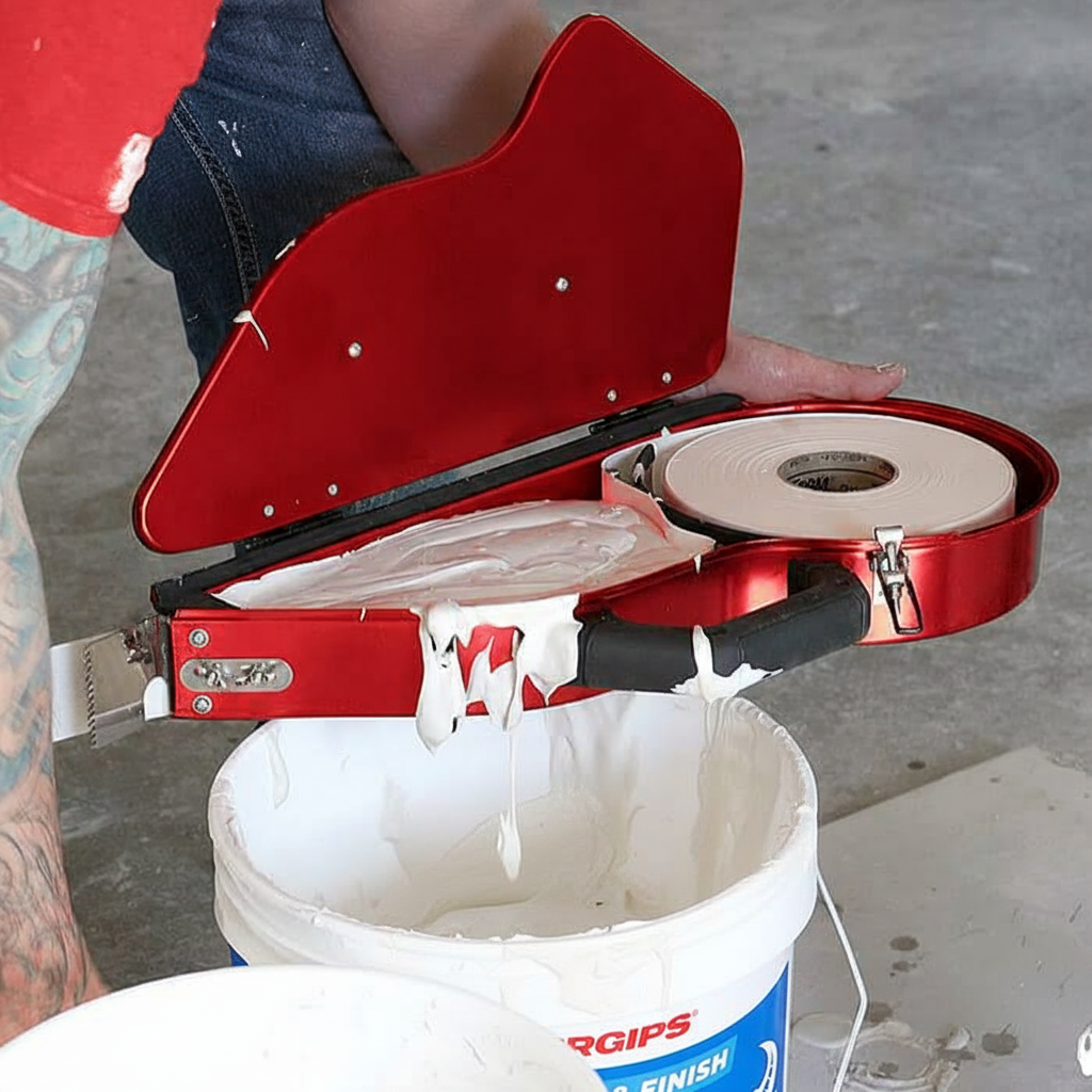 - Spolehlivá spolupráce s aplikátory: Tyto tmely byly vyvinuty s ohledem na strojní zpracování. Mají delší otevřený čas a nestvrdnou vám v nářadí během práce. Sádrové práškové tmely tuhnou chemicky často už za 30-90 minut, což by v aplikátoru znamenalo katastrofu (ztvrdnutí hmoty uvnitř). Naproti tomu pastové směsi tvrdnou pozvolna odpařením vody, takže zůstávají déle zpracovatelné a lze je dle potřeby ředit vodou. Aplikátory vyžadují spíše řidší konzistenci (přibližně jako hustý jogurt), aby tmel snadno protékal a rovnoměrně obaloval pásku – lehčený tmel lze naředit velmi snadno a stále si zachovává potřebnou pevnost a přilnavost. Navíc v pastových směsích nejsou hrubé částice, které by ucpávaly štěrbiny nástroje. Výsledkem je plynulé nanášení bez ucpávání a snadné čištění. Není divu, že i samotní výrobci aplikačních nástrojů doporučují používat výhradně vzduchem schnoucí pastové tmely a varují před rychletuhnoucími směsmi, které mohou nástroje ucpat.
