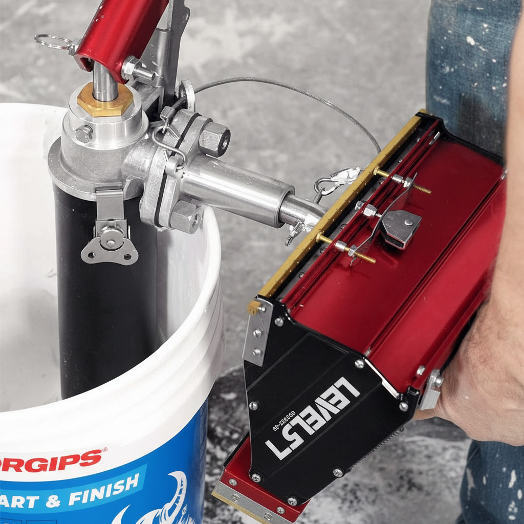 - Naplňte box tmelem: Připravte si dostatečné množství stěrkovací hmoty vhodné konzistence v kbelíku. Nejefektivnější způsob plnění boxu je pomocí plnicí pumpy s nástavcem, který pasuje do otvoru na čele boxu. Zasuňte plnicí trysku pumpy do plnicího otvoru boxu a pumpujte, přičemž boxem kývejte ze strany na stranu, aby se tmel rozprostřel rovnoměrně. Sledujte, jak se box plní – jakmile uvidíte tmel vycházet ze štěrbiny pod břitem, máte naplněno. Box pak opatrně odpojte a setřete případné přebytky tmelu z vnějšku.